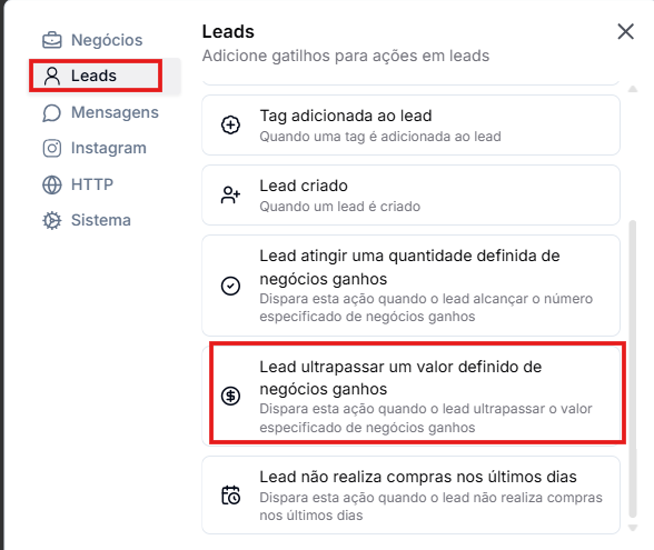 - Acesse as opções de gatilhos do lead