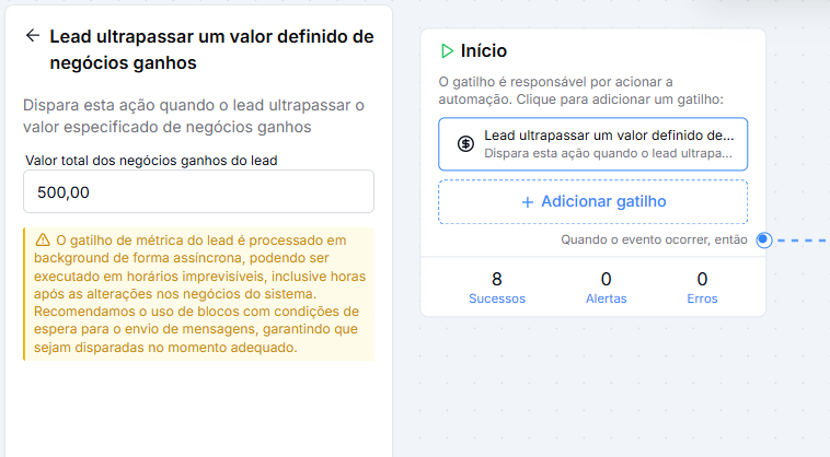 O gatilho "Lead ultrapassar um valor definido de negócios ganhos" é utilizado para iniciar automações e tem uma configuração simples. Antes de utilizar esse gatilho leve em conta a observação:
