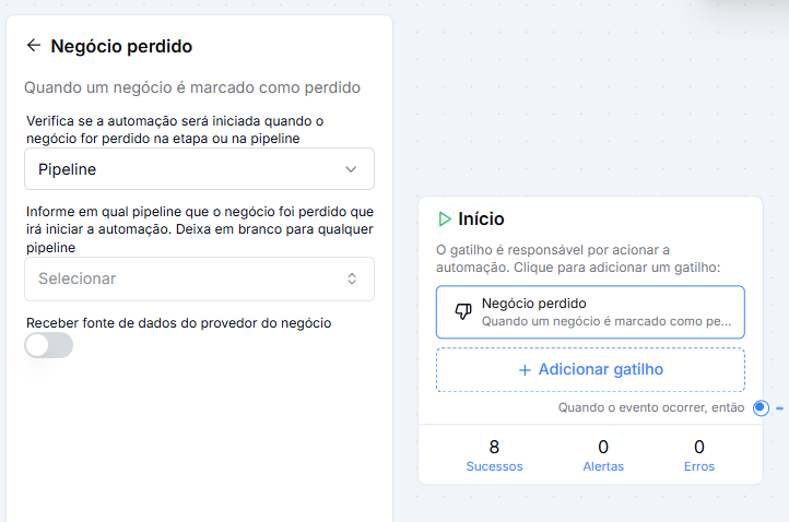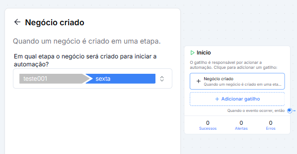 Automação > Criar Nova Automação > Gatilho > Negócios