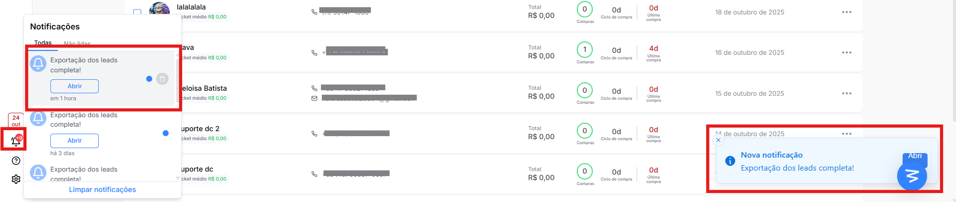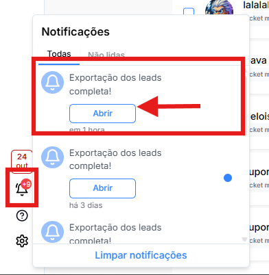 - Espere alguns estantes até aparecer a notificação de "Exportação dos leads completa".