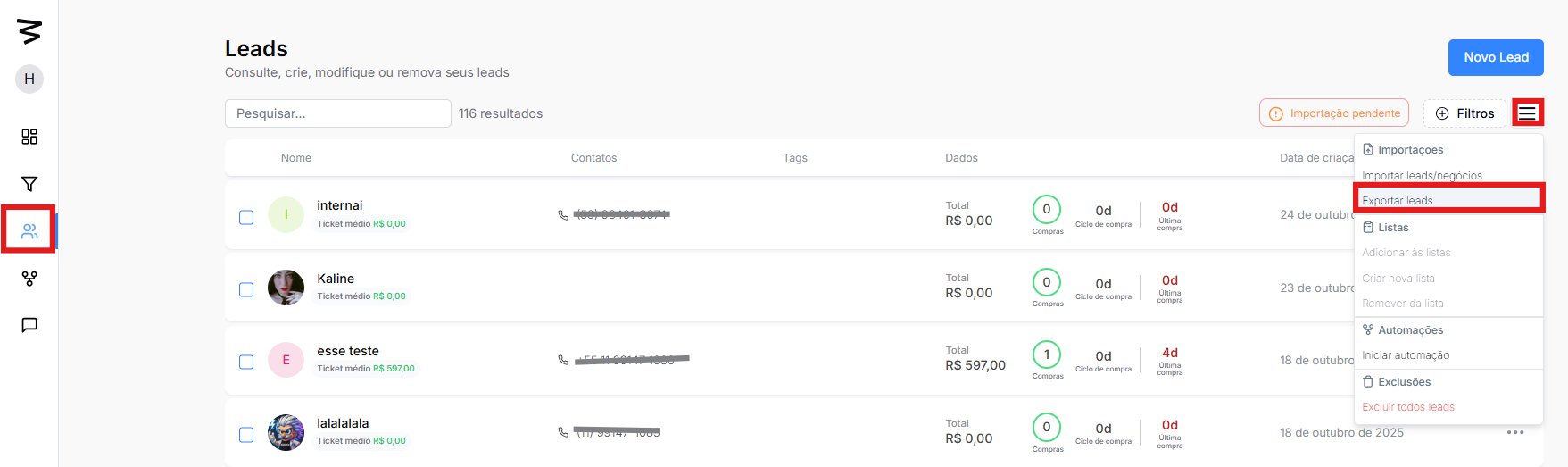 Exportação de Leads