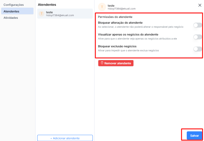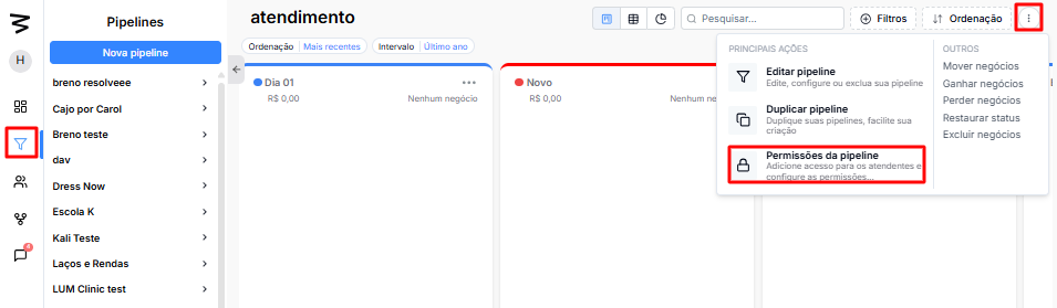 Etapa 3: Definindo as permissões de um atendente na pipeline