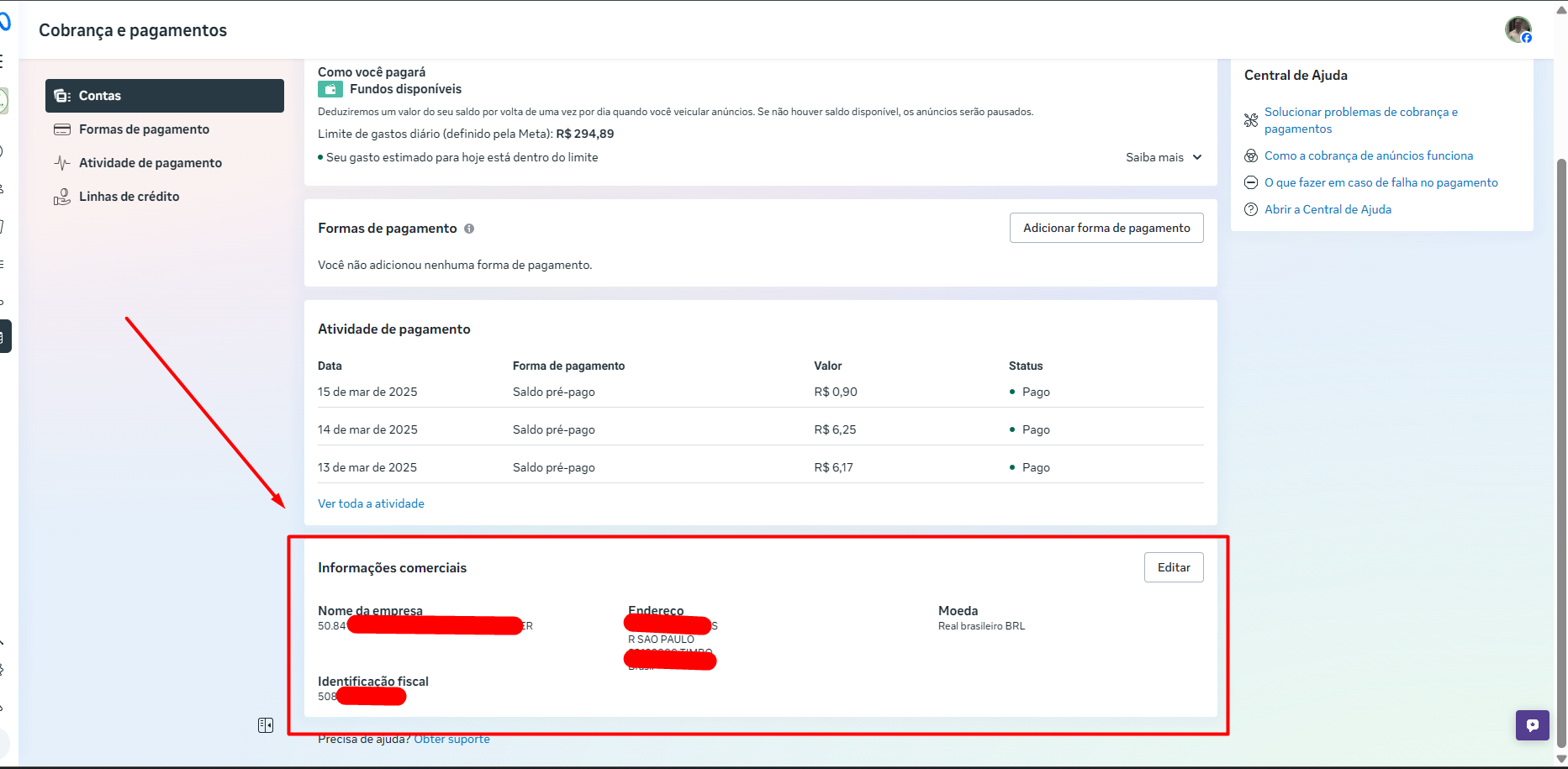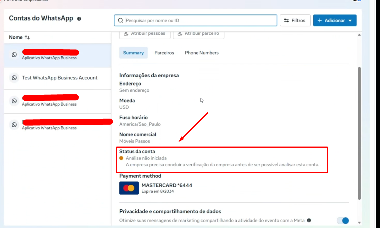 The WhatsApp Business account doesn’t have a credit card linked in Meta Business Manager.