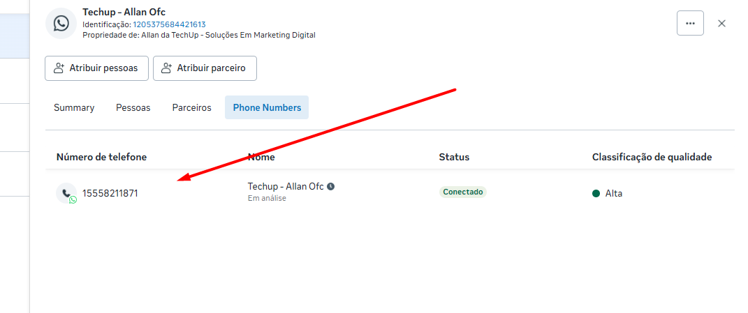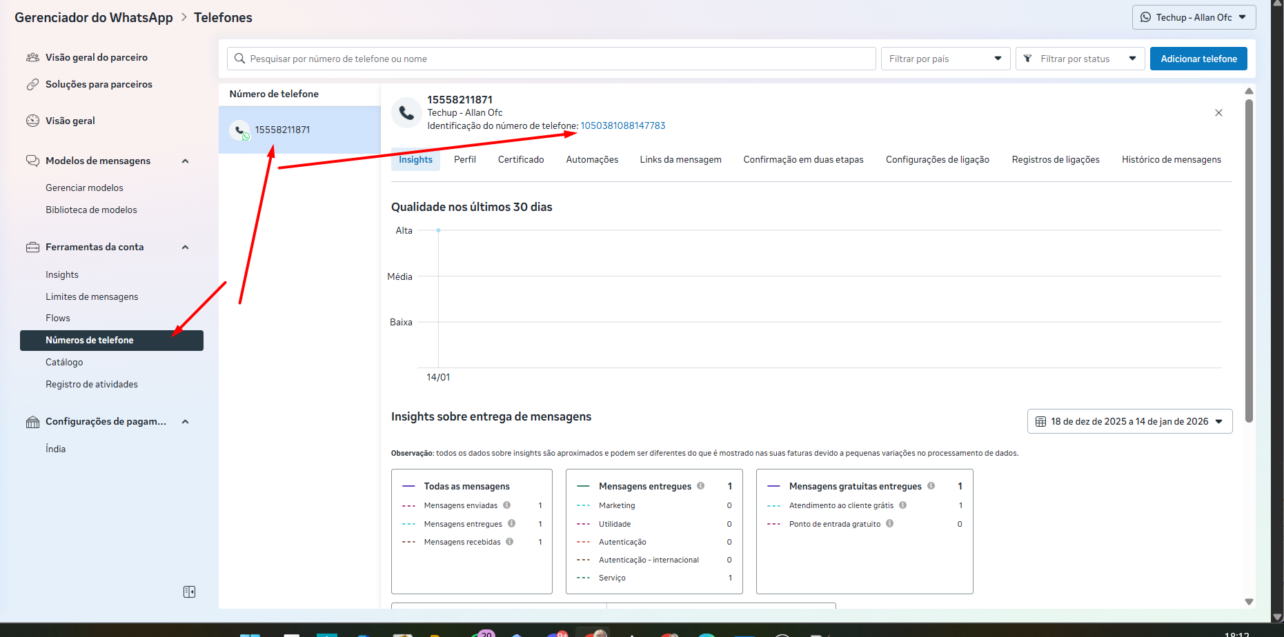 Image 11D - WhatsApp Manager screen. If you have more than one number, select the correct one, by clicking on it, it will open and show its ID as marked in image 11D. Save it in a safe place as the phone number id.