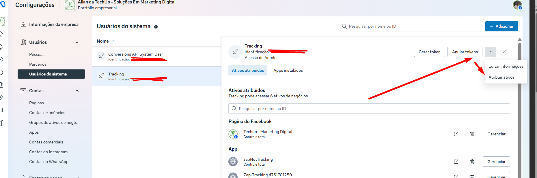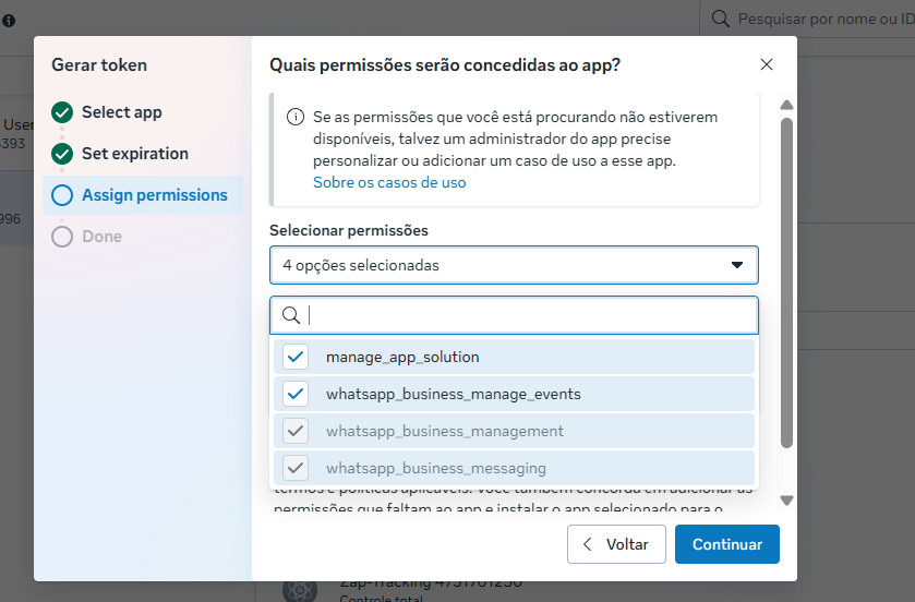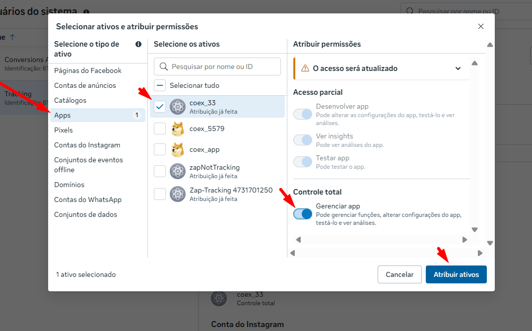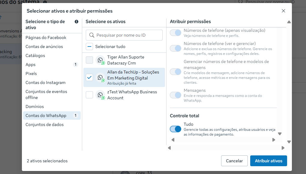 Click on Apps, select the app created, and give it Full Control, now go to WhatsApp Accounts, and do the same procedure, this time selecting the WhatsApp account that you will use (created previously), give the permissions with Full Control and click on Assign Assets. See Image 16.