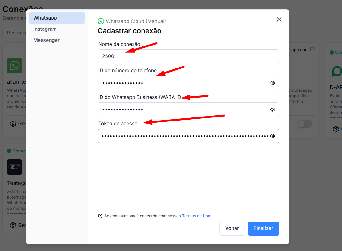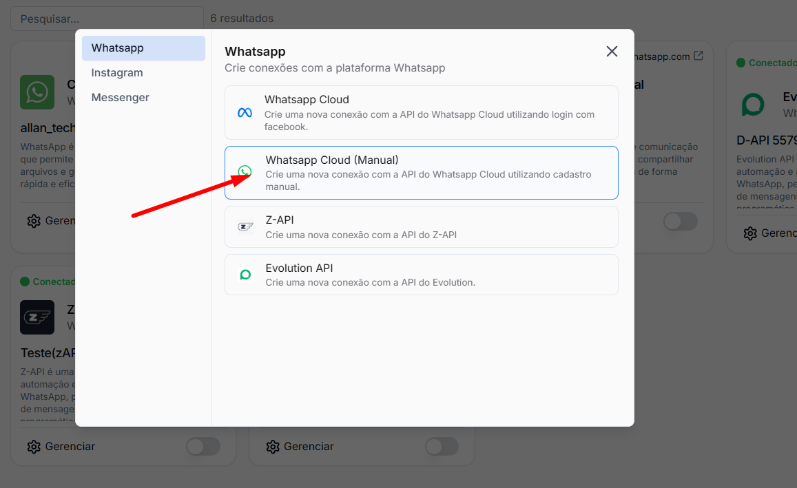With the generated token, let's open the CRM at this link. Create a new Manual WhatsApp Cloud connection. See Image 22.