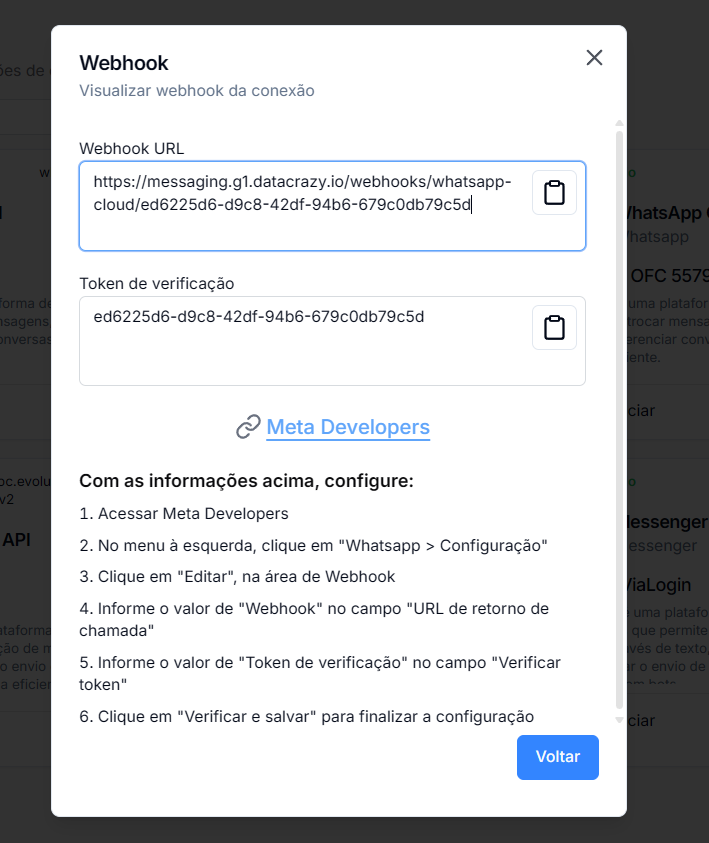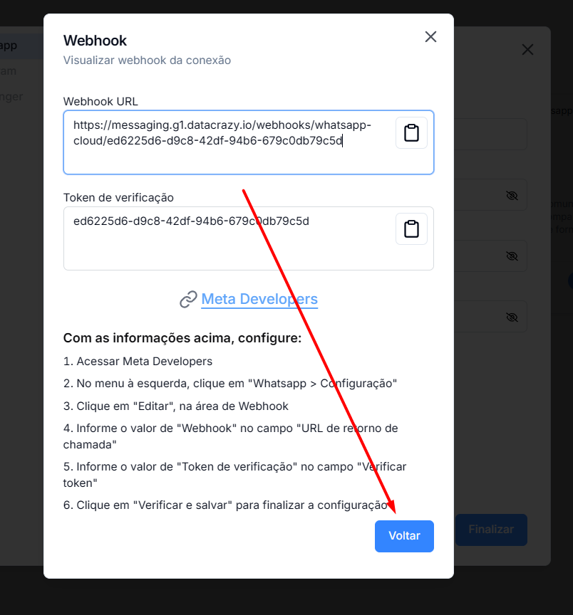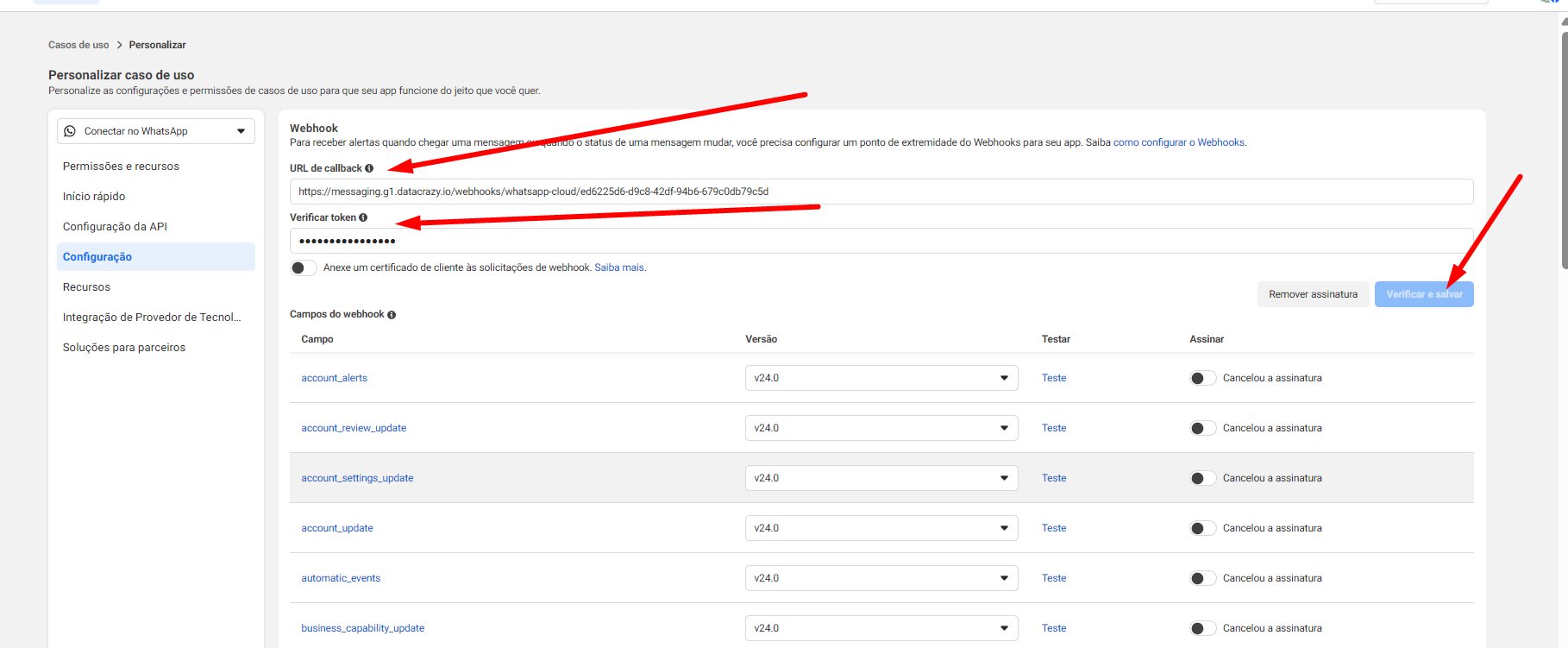Now, copy and paste the webhook url and the previously saved verification token. Click on Verficar e Salvar. See image 25 above.