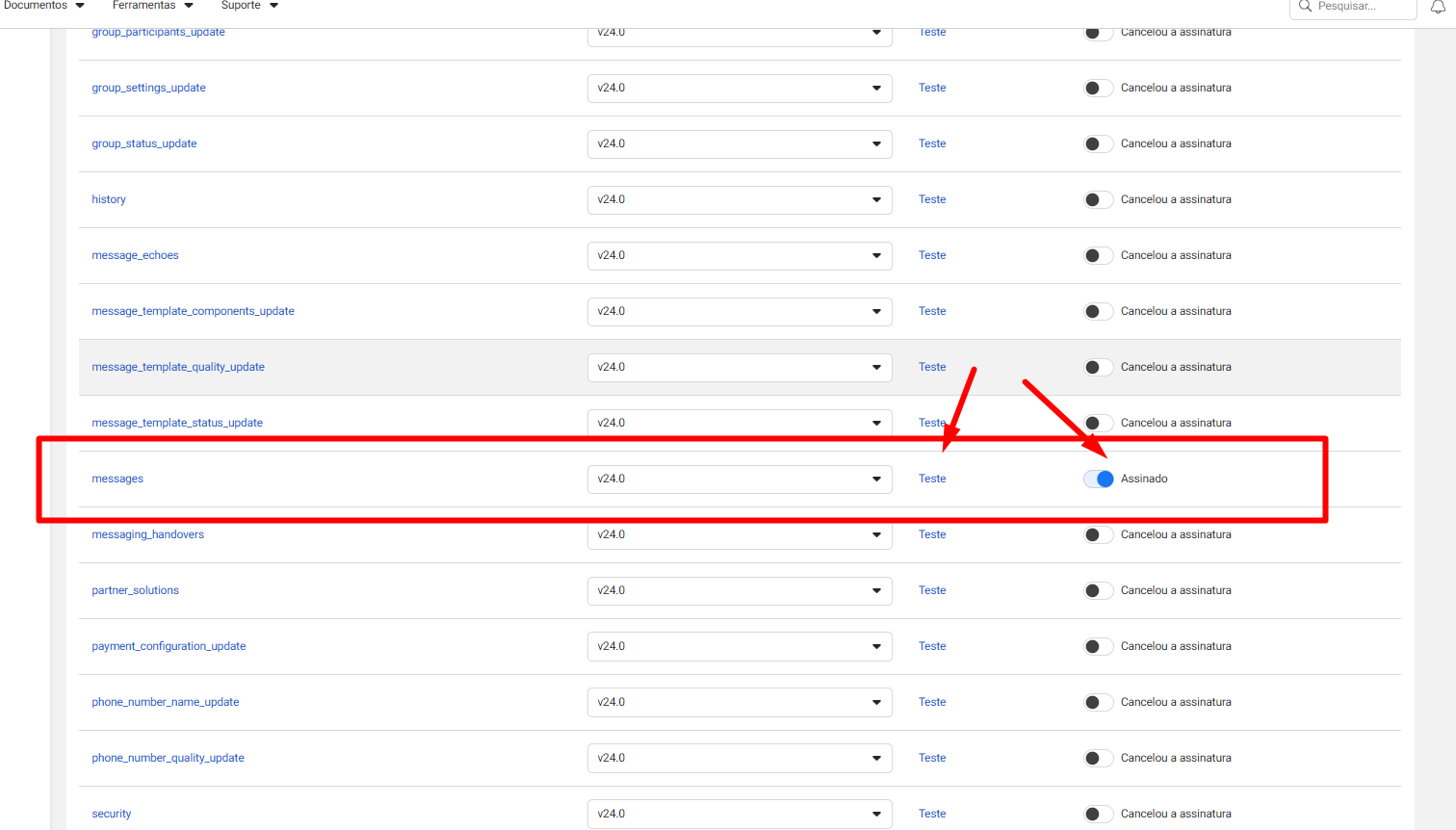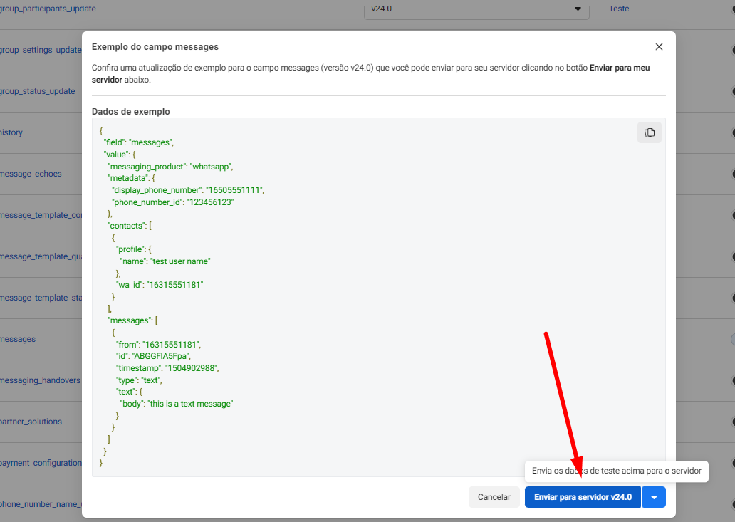 Wait for it to save, and then refresh the page. Scroll further down, look for messages. Turn it on with the button and click on test. Send the test event by clicking on enviar para o servidor.. See Image 26 and 27.