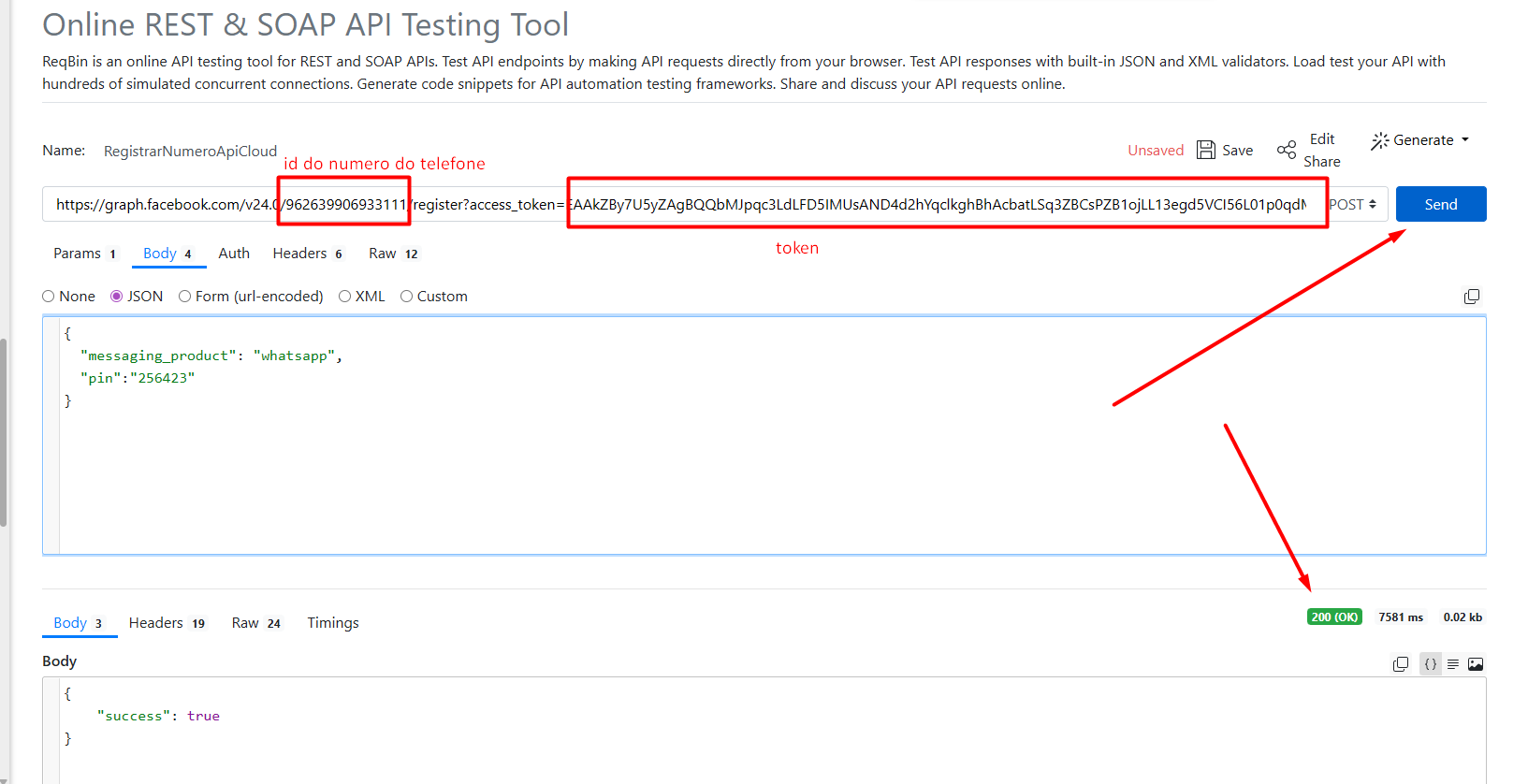 now, go to this link, enter as indicated the phone number id, the 6‑digit pin (if you don’t have one, enter one and it will be saved with it), and the token, and click on send. If the response is in green and (OK), it worked. See image 28. (Showing success in the bottom right corner)
