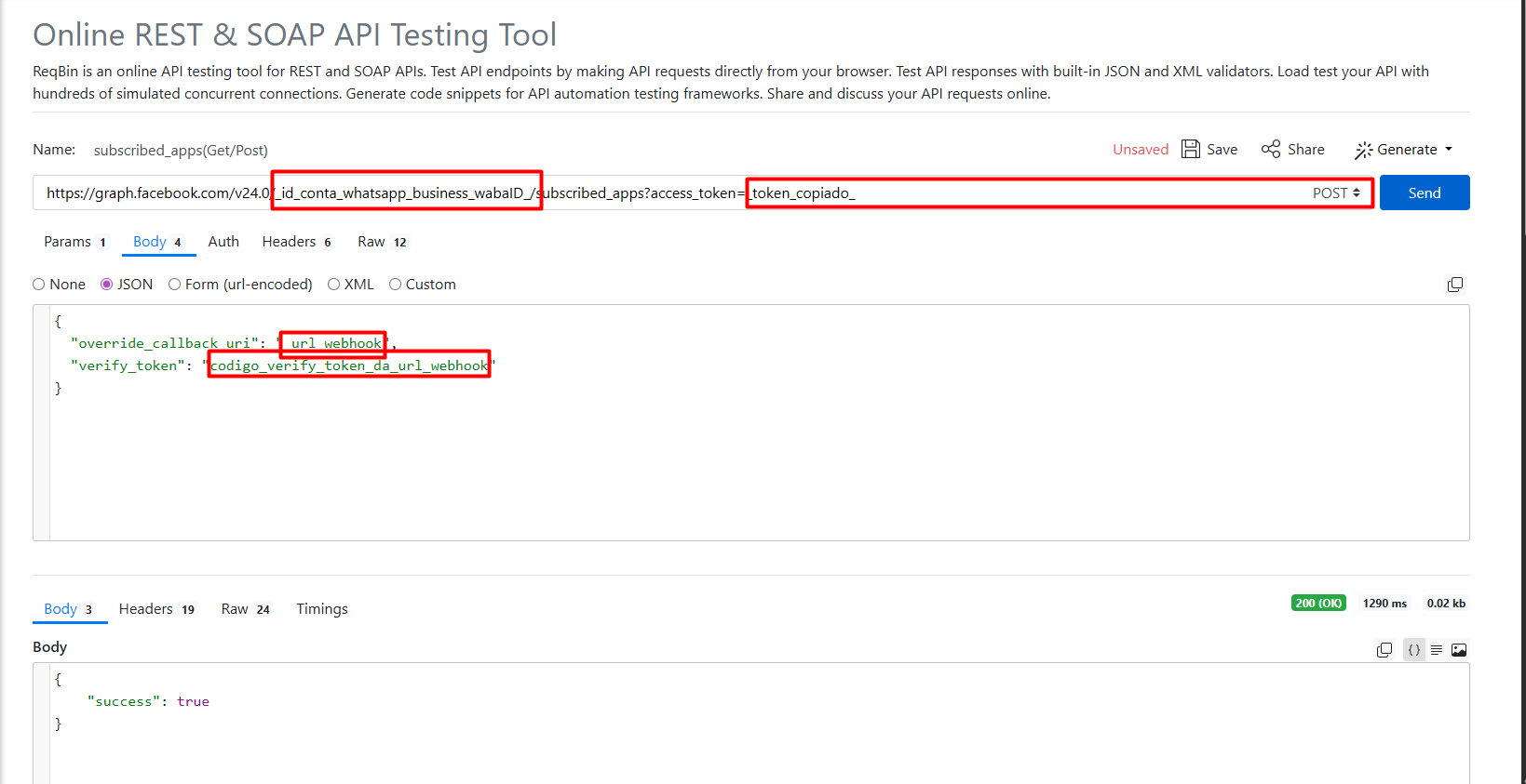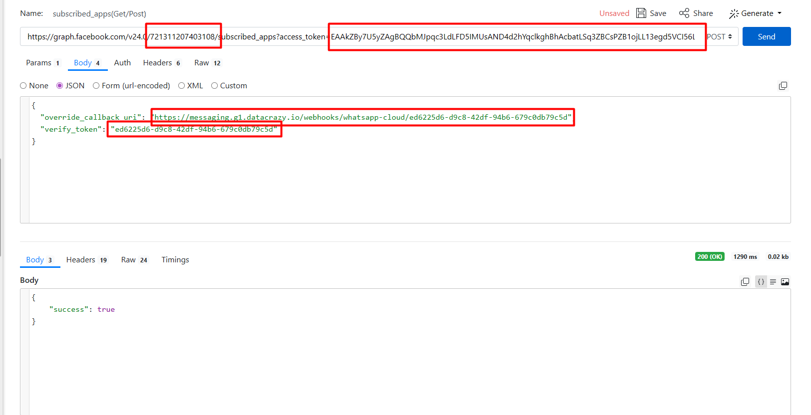 Now we need to make one more API call, similar to the tenth one. Click this link Fill in the WhatsApp Business account id (wabaID), and the token saved earlier.