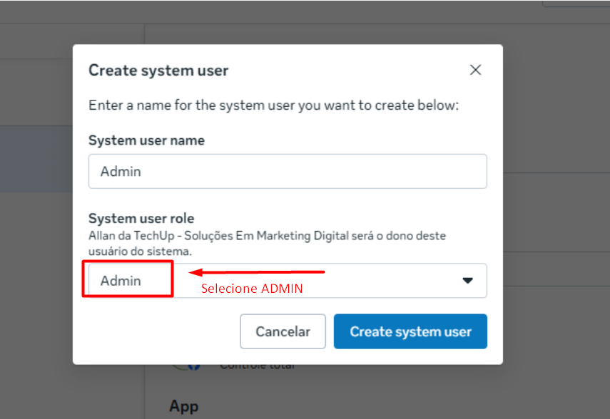 If you don’t have a user listed (see image 15) create one, always make sure it’s Admin Access, click Add, set the type to ADMIN, and use the name Admin. Click on 'Create system user' or 'Criar usuário de sistema'. See image 14.