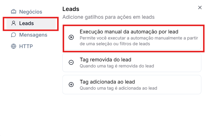 Escolha o Gatilho Inicial. Neste caso, selecione "Leads" e defina como "Execução Manual", pois o disparo será iniciado manualmente.