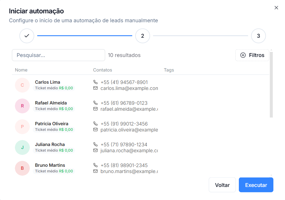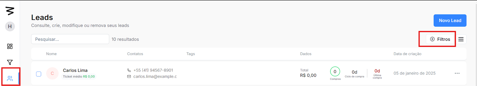 Após aplicar o filtro, será exibida a lista de leads que atendem aos critérios selecionados.