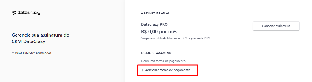 No botão gerenciar planos, será aberta uma nova aba exibindo suas assinaturas atuais e as formas de pagamento cadastradas. Para alterar, clique em adicionar nova forma de pagamento.