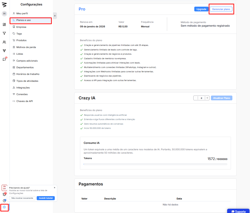 Ao abrir a seção de planos e uso, será exibida a pagina correspondente. Clique em gerenciar plano para prosseguir